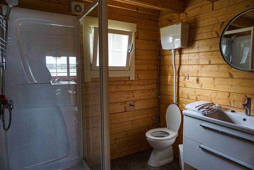 Na een middag per e-bike de omgeving verkennen, stap ik bij terugkeer in de Water Lodge direct onder douche. Voor de badkamer is hetzelfde van kracht als voor de slaapkamer, niet heel groot, maar voldoet meer dan prima. De douchecabine is schoon en de straal lekker krachtig. Verder is de badkamer voorzien van een toilet en een spoelbak met daaronder een ladekastje waarin je je handdoeken en/of toiletspullen kwijt kunt.