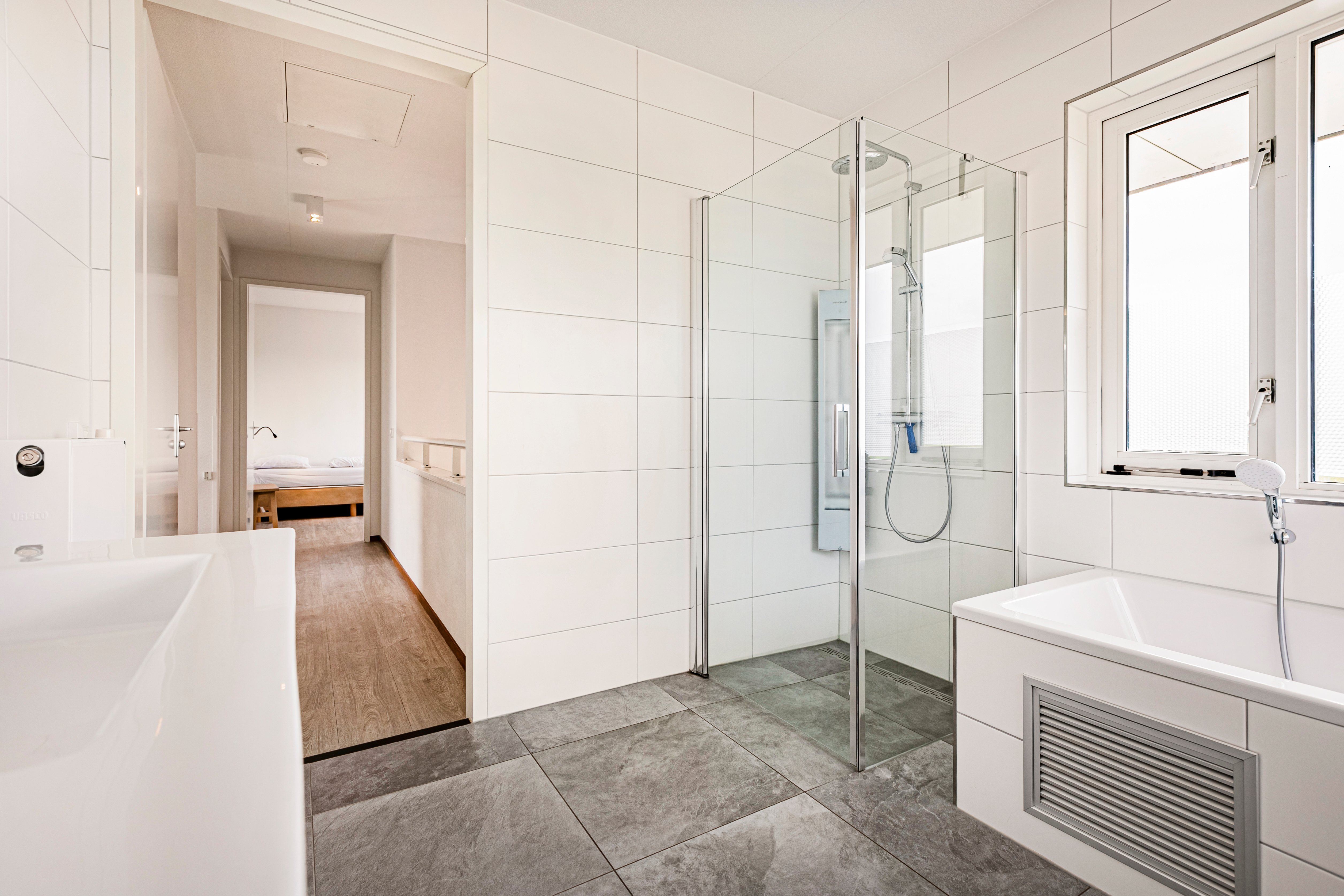 Badkamer met bubbelbad, rainshower met handdouche, wastafel en toilet op de eerste verdieping