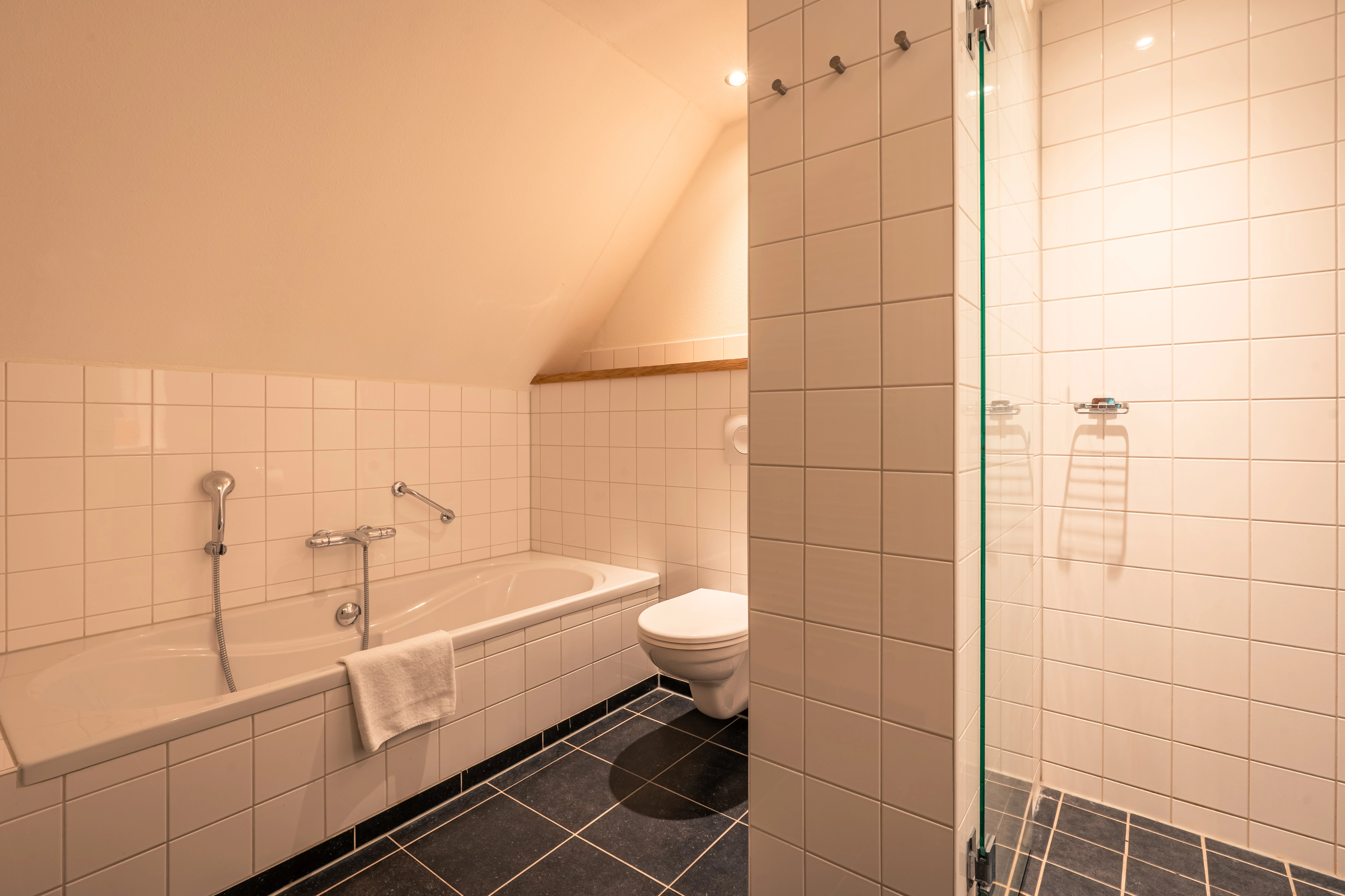Twee badkamers met ligbad, inloopdouche met rainshower, wastafel en toilet op de eerste verdieping