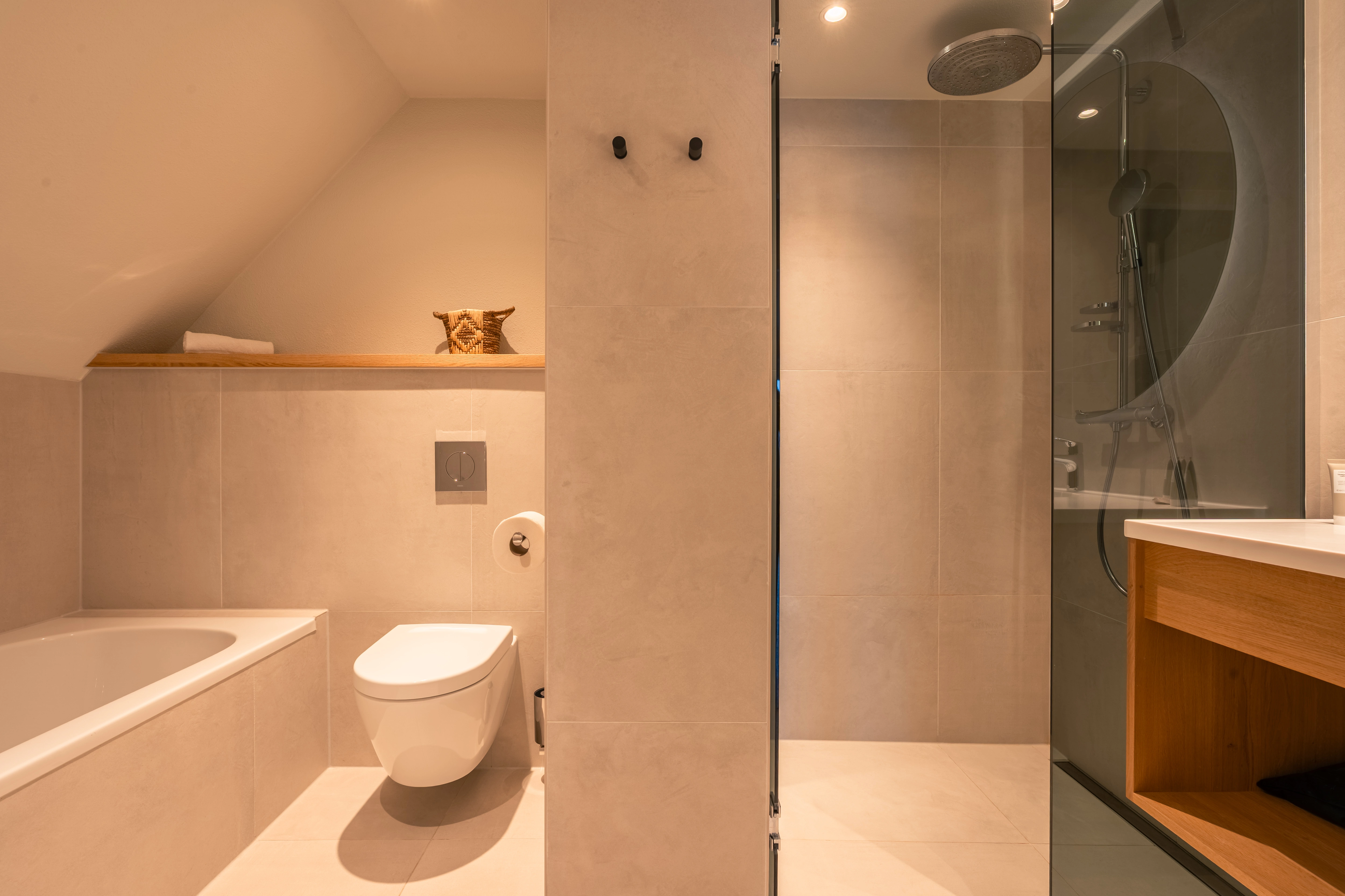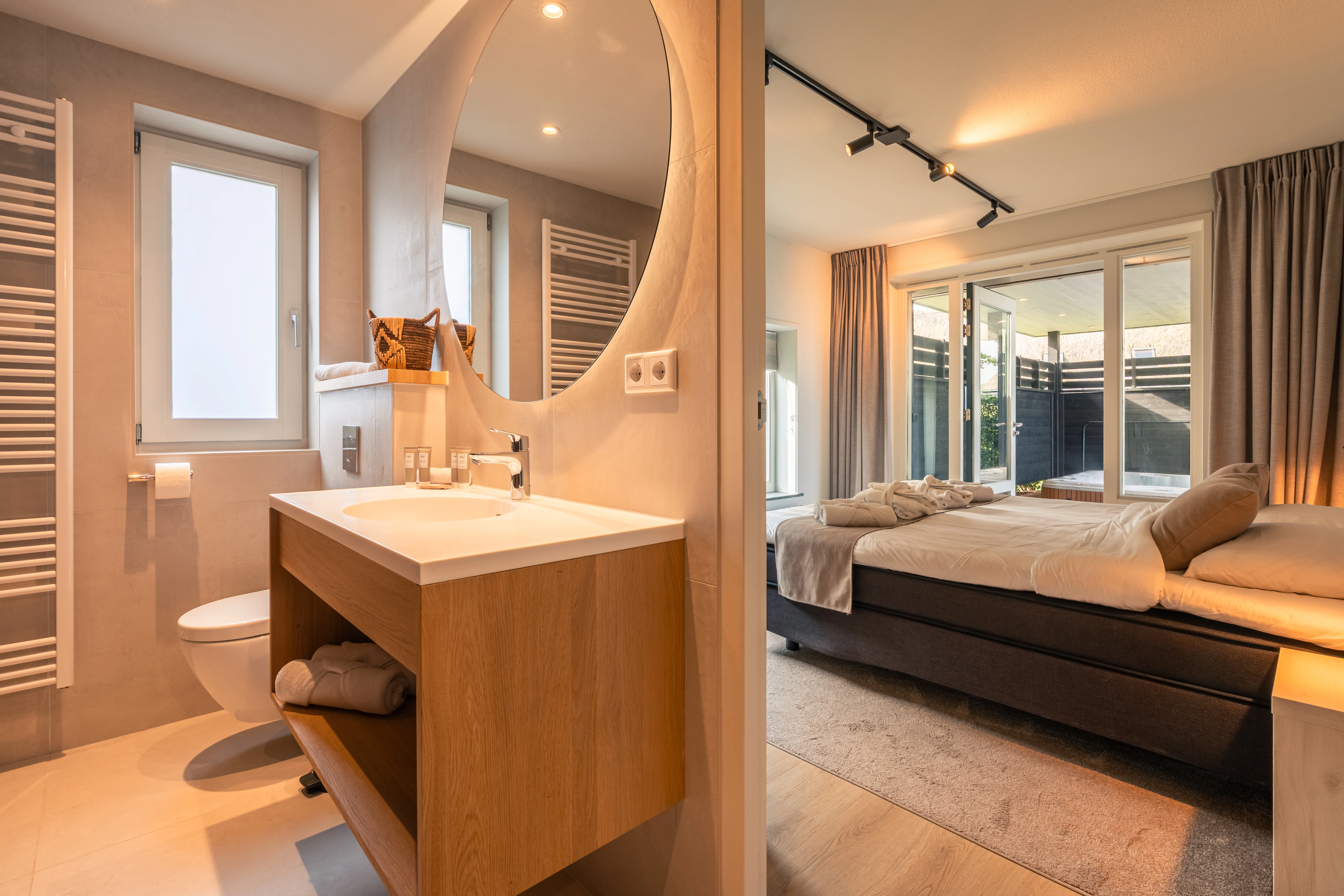 2 badkamers met bubbelbad, inloopdouche met rainshower, wastafel en toilet op de eerste verdieping